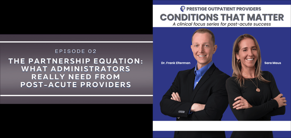 The second episode of Conditions That Matter: A Clinical Focus Series for Post-Acute Success brings together host Sara Maus, Director of Operations and Business Development at Prestige Outpatient Providers/National Psychiatry, Dr. Frank Elterman, and Vincent—a healthcare leader with nearly 40 years of clinical experience who has served as nursing home administrator, executive director, director of nursing, floor nurse, and CEO. Vincent currently leads a 120-bed facility offering both short-term and long-term rehabilitation care.